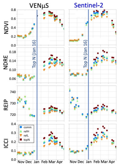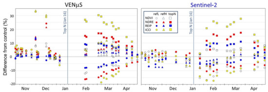 Figure 11 shows that the refH (triangles) and refL (circles) values are only slightly higher/lower (up to 5%) than the control (except ICCI—yellow), whereas topN (squares) shows a much higher difference by all VIs. Since refL did not receive the topN (after 16 January), all VIs exhibit the deficiency (circles are always lowest). ICCI showed the highest difference between managements (for both VENµS and Sentinel-2).