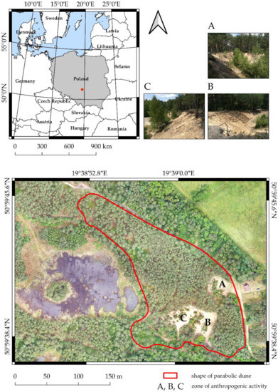 The parabolic dune and its surroundings, as located against the background of Poland and Europe; human activity related to sand exploitation: side views and overhand views: A—eastern slope; B, C—southern slope [52].