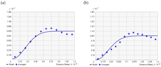 Experimental variograms and fitted theoretical models in relief modelling for the variable used (elevation): (a) present relief; (b) primary relief. Blue crosses and lines are experimental semivariograms and theoretical Gaussian models, respectively.