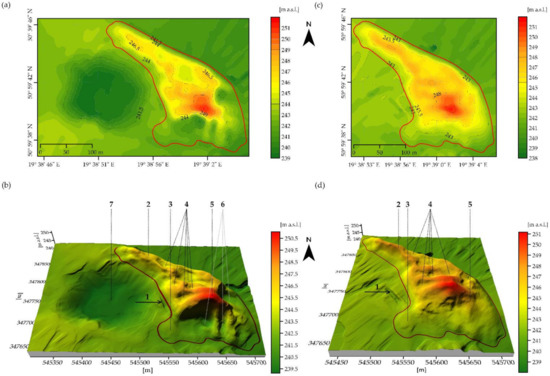 The primary relief (Figure 7c,d) analysis of the surveyed dune allows one to conclude that it was relatively well-developed before the beginning of the sand exploitation for building purposes and distinguished by the regular shape characteristic of a typical aeolian form. The exception was the southern arm in its embryonic stage of development. The crest portion was well-developed and rose to the height of 251.2 m a.s.l. (Table 4). It dropped rather smoothly in the southern-eastern direction where it reached the height of 241.7 m a.s.l. More clearly so than is the case currently, the shorter arm was well-distinguished, situated at the height of 234.3 m a.s.l. and had reached the width of 38.4 m. The northern arm was also well-developed and had the shape of a regular levee and rose to the height of 248.1–245.8 m a.s.l. and had reached the width of 55.4 m. In turn, the ridge portion had been slightly fragmented and within its range, five trough-like depressions at an early stage of development were indicated. The biggest of these was situated at the junction of the ridge and northern arm portions and had reached a surface area of approximately 1035.7 m2 (Figure 7c,d).