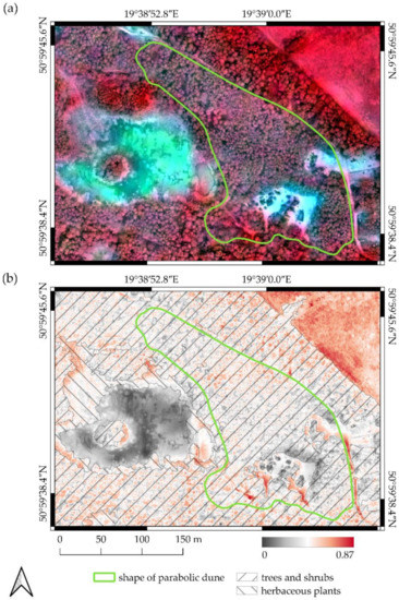 The colour-infrared (CIR) composition indicated the vegetation occurrence with differentiated habitat requirements within the dune range, including its depleted portions and the adjacent terrains. In this range, the exception was a blowout periodically filled with water situated to the west of the surveyed object where species composition was connected especially with the hydrophytes (Figure 2 and Figure 9a).