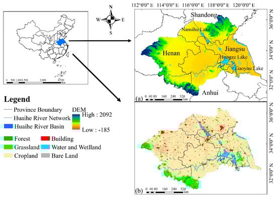 Location of the HRB. (a) Digital elevation model-derived map (from ASTER GDEM data) of the HRB showing Jiangsu, Anhui, Shandong, and Henan provinces and three main lakes (Nansihu Lake, Hongze Lake, and Gaoyou Lake). (b) Land use map (from MOD12Q1 data) of the HRB in 2001.