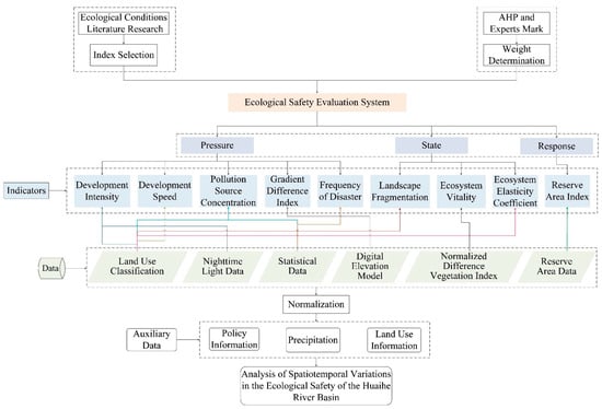 The Huaihe River Basin (HRB) is characterized by high population density, rapid economic development, a high land utilization rate, and numerous ecological problems []. These features are the same as most basins, so it is well suited as a typical case. This study aimed to: (1) construct an ES evaluation system applicable to most basins based on the PSR framework and AHP method, and provide an assessment method for the sustainable development of basins; (2) identify the driving factors affecting sustainable development of the basin; and (3) offer guidance for the realization of SDG 15 in the HRB. Considering the focus of SDG 15, and combined with literature on the actual HRB situation, this study selected indicators based on the PSR framework. Then, the weights of the indicators were determined using the AHP and an ES indicator assessment system was established. By combining of satellite data and GIS technology, this study revealed the spatiotemporal variation characteristics of ES in the basin. Finally, this study analyzed the spatiotemporal changes in ES and explained the changes using climate and policy data. The results will be useful to determine the causes of eco-environment degradation and provide guidance for implementing SDG 15.