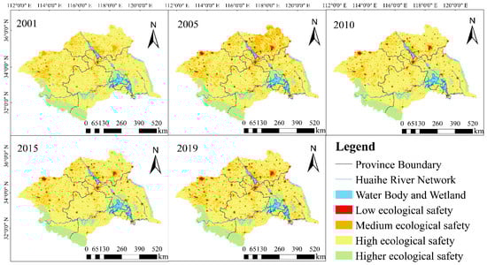 Spatial distribution of ES levels in the HRB in 2001, 2005, 2010, 2015, and 2019.