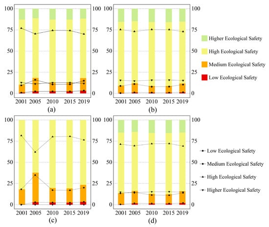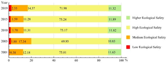 The proportion of area with low ES remained low and did not extensively change during the 2001–2019 period. The maximum value of 2.33% was reached in 2019. The maximum proportion of area with medium ES (17.34%) was observed in 2005, and the proportion decreased to its minimum value (11.31%) in 2010. A large proportion of the basin had a high ES level each year. In 2001, the proportion of area with high ES reached its maximum value of 75.81%. After that, it decreased sharply to its minimum value of 69.95% in 2005 (decrease of 5.86%). Subsequently, it increased again in 2010 and 2015, then decreased to 71.98% in 2019. From 2001 to 2015, the proportion of area with higher ES first decreased, then increased. The minimum value of 10.83% was reached in 2005, and the peak value of 11.89% was attained in 2015. The proportion then decreased slightly by 0.57% in 2019.