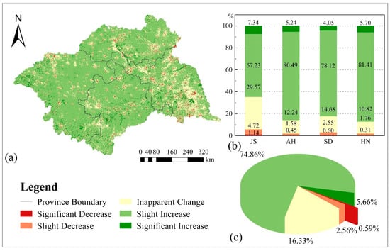 (a) Change trend of the ES value in the HRB. (b) Proportion of area associated with each trend in Jiangsu (JS), Anhui (AH), Shandong (SD)), and Henan (HN) provinces. (c) Proportion of area associated with each trend in the HRB.