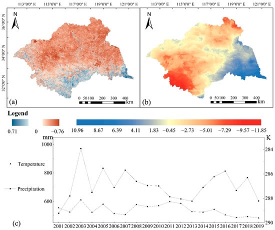 (a) Spatial distribution map indicating the correlation coefficient between the ES level and the average annual precipitation for each grid. Negative values represent negative correlations, while positive values represent positive correlations; a higher absolute value indicates a stronger correlation. (b) Change trends of precipitation in the HRB. Positive values indicate an increasing trend, while negative values indicate a decreasing trend; a lower absolute value indicates a smaller change in precipitation. (c) Average annual precipitation and temperature in the HRB from 2001 to 2019.