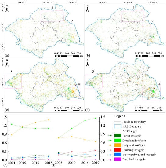 Land use transfer maps of the HRB representing (a) losses and (b) gains in land-use types between 2001 and 2005, and (c) losses and (d) gains in land-use types between 2001 and 2019. Proportion (e) loss and (f) gain of each land-use type related to land-use transfer each year.