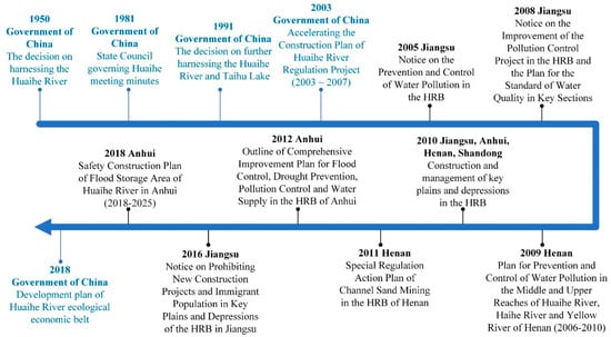 At the national level, comprehensive management of the HRB has been underway for a few decades (Figure 9). In 1950, the Government of China promulgated its decision to harness the Huaihe River and clearly defined guidelines for regulating the use of the river; the goals were holding back flood waters and ensuring water conservation. By 2018, the Government of China had issued five major documents; the focus had shifted from flood storage to pollution control, ecological restoration, and sustainable development, consistent with changes in socioeconomic development. Each province issued a different number of documents emphasizing various aspects of Huaihe River management between 2001 and 2018 (Figure 9), which may explain the differences in ES status among the four provinces.