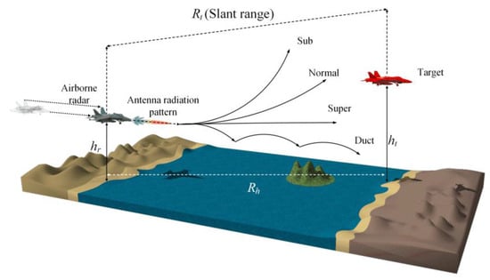 Figure 1 shows a conceptual figure of the air-to-air airborne radar wave propagation in accordance with an anomalous atmospheric environment. The gray and red aircrafts indicate an airborne radar and a target, which are located at heights of hr and ht, having a distance of Rt (slant range) and a horizontal range of Rh. The target is placed under various atmospheric conditions according to the wave refraction. To observe the wave refraction of the airborne radar, the refractive index needs be calculated using the measured atmospheric data such as temperature, air pressure, and relative humidity based on Equations (1)–(3), which are usually obtained by employing a rawinsonde or a GPS sonde [27,28,29].