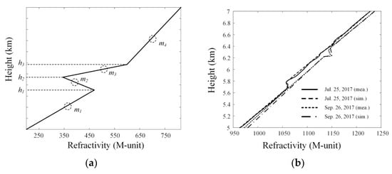 Modified refractivity according to height: (a) the quad-linear refractivity model; (b) comparisons between the actual refractivity data and the quad-linear models.