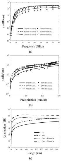 Calculated atmospheric gas and rainfall attenuation results: (a) rainfall attenuation according to frequency; (b) rainfall attenuation according to precipitation; (c) gas and rainfall attenuation according to range.