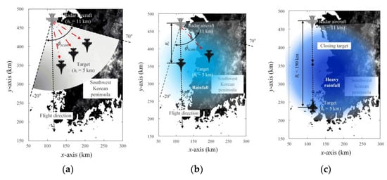 Three air-to-air scenarios for the TDP simulation in anomalous atmospheric environments: (a) azimuth beam scanning in an anomalous atmospheric environment; (b) azimuth beam scanning in a rainy environment; (c) encountering a target in a heavy rain environment.