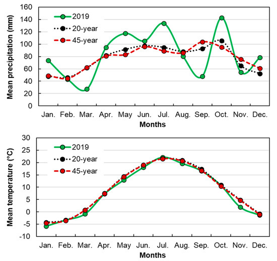 Monthly precipitation data were accessed from CLIMOD2 [26]. The cumulative precipitation recorded in 2019 at this location between May and November was 685 mm, with a monthly average of 98 mm (Figure 1). May and June received 117 and 105 mm, respectively, which were highly favorable for initial corn growth. Compared to the precipitation of 2018 reported earlier [8], precipitation was optimal for the growing season.