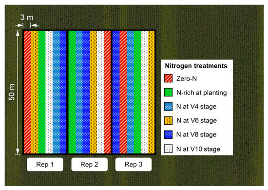 Illustration of the experimental design and UAS data collection timing for N treatments conducted at the Musgrave Research Farm, Aurora, NY, USA. The base-map shown is the aerial imagery obtained at the R4 growth stage of corn on 22 August 2019. The zero-N treatment received starter N (33 kg N ha−1) only, the N-rich treatment received 336 kg N ha−1 before emergence, and all four sidedress treatments received 202 kg N ha−1 at their respective growth stages.