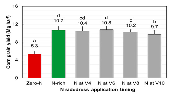 Yields within the same treatment varied from 3.8–6.9 Mg ha−1 for the zero-N control plots, to 8.6–12.4 Mg ha−1, 8.5–11.9 Mg ha−1, 9.3–12.2 Mg ha−1, 9.1–11.4 Mg ha−1, and 8.1–11.2 Mg ha−1 for the N-rich and sidedressing at V4, V6, V8, and V10 treatments, respectively. Delaying sidedressing beyond V6 reduced yield, consistent with findings from prior years at the same location [8].