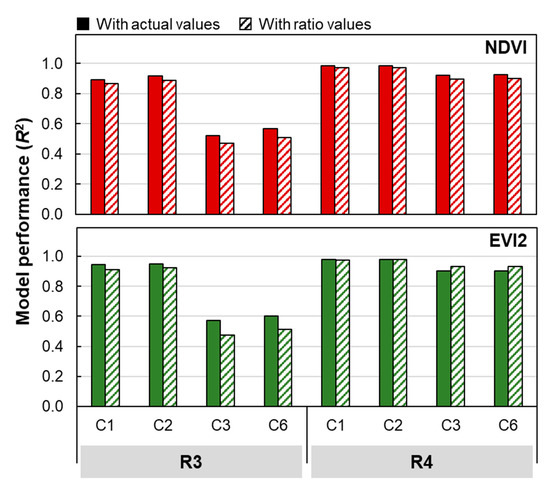 Comparison of corn yield estimation model performance with actual and ratio values of selected vegetation indices and selected sidedress treatment combinations from the UAS imagery obtained at R3 and R4. Note: C1 indicates zero-N + N-rich (all N applied at planting), C2 indicates zero-N + sidedressing at V4, C3 indicates zero-N + N-rich + sidedressing at V6, and C6 indicates zero-N + N-rich + V4 + V6.
