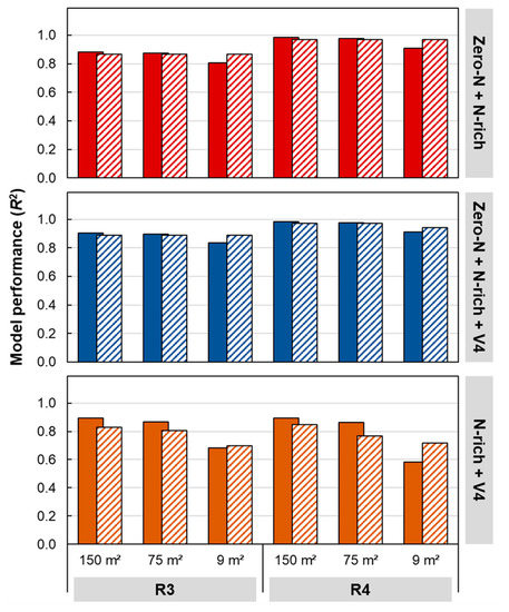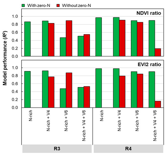 The zero-N treatment causes a significant yield reduction, as has been the case in other remote sensing studies [8,34]. While including the zero-N treatment resulted in more reliable models, excluding this treatment when developing models slightly reduced the R2 of the models (Figure 7), as long as sidedressing took place early (V4) and sensing was performed at R4. Models that included imagery from the plots sidedressed at V6 showed considerably lower R2 values. Models based on NDVI showed more stable performance without zero-N than models based on EVI2, perhaps reflecting the sensitivity of EVI2 in capturing subtle differences in vegetation. Such differences could have caused variability and likely be the reason for reduced R2 within treatments without zero-N.