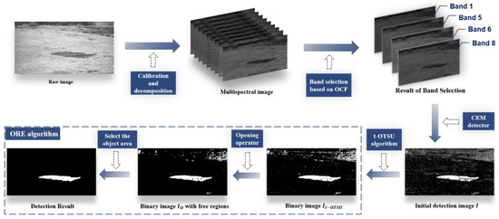 The flow chart of the proposed algorithm (Figure 1) shows that the CEM detector plays a key role in distinguishing the camouflaged nets and vegetation, and the ORE algorithm plays a critical role in obtaining an accurate and complete target contour. Although the results show that the performance of CEM-T is better than that of CEM-t-OTSU in simple scenarios, the t-OTSU algorithm showed its advantages when the scene becomes more complicated, such as the last UAV scene. In summary, the t-OTSU algorithm is mainly used to adaptively segment out the complete target contour, contributing to the robustness of the proposed algorithm in different scenarios. Meanwhile, the ORE algorithm is used to accurately obtain the target region, playing a significant role in improving the performance of our algorithm. For the application of camouflaged targets detection, these two algorithms are both indispensable in our study. In general, this algorithm can overcome influencing factors such as low spectral resolution and poor lighting conditions and is more suitable for fast and high-precision detection of unoccluded targets within 100 m. However, when the light intensity in the scene is lower than 800 lux, the detection performance of our algorithm is significantly reduced. Meanwhile, it should be noted that this algorithm is not suitable for the detection of unknown camouflaged targets, which is also a common problem of algorithms such as CEM and HCEM.