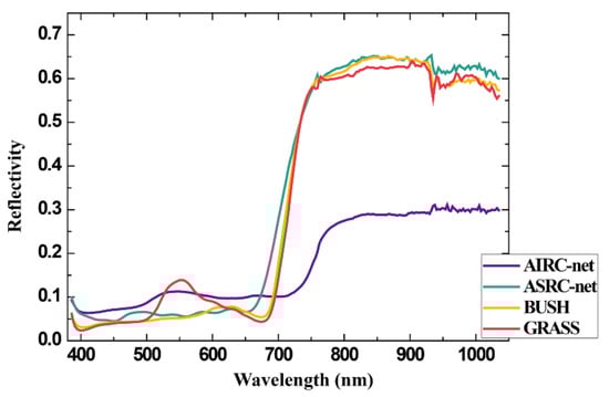 We select the anti-spectral reconnaissance camouflaged net (ASRC-net) with a small mosaic pattern and the anti-infrared reconnaissance camouflaged net (AIRC-net) with a deformed camouflaged pattern as the target, as shown in Figure 2c,d, respectively. We used a hyperspectral camera (GaiaField-V10E, Dualix) with a spectral response range of 400–1000 nm and a spectral resolution of 2.8 nm to obtain the spectra shown in Figure 3. It should be noted that the target spectrum is affected by many factors such as seasons, vegetation growth status, and light conditions. Figure 3 shows that the camouflage characteristics of the two camouflaged nets are significantly different even under the same conditions. In the range of 660–975 nm (the spectral range of the snapshot multispectral camera), the spectrum of the ASRC-net is close to that of the vegetation, which increases the difficulty of camouflaged target detection. The AIRC-net effectively reduces the radiation of the targets in the near-infrared band, which has the ability of anti-infrared reconnaissance. Therefore, we use these two camouflaged nets to fully verify the feasibility of the proposed algorithm.