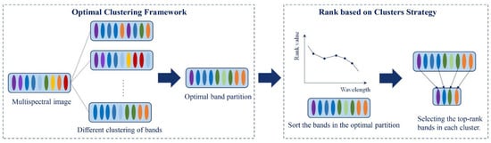 The flow chart of the OCF algorithm (in the figure, each color refers to a cluster of bands). First, the optimal band partition via OCF is based on the given objective function. Then, all the bands are evaluated through an arbitrary ranking method. Finally, the top-rank bands are selected in each cluster.