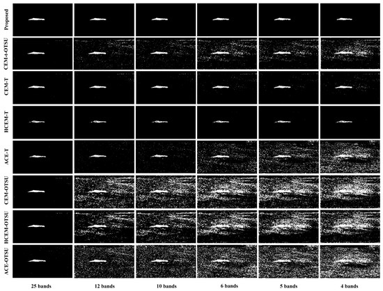 The detection results of the ASRC-net and AIRC-net are exhibited in Figure 6 and Figure 7, respectively. It is notable that as the number of bands decreases, the misjudged areas all increase with all five comparison algorithms except HCEM-T. With inadequate band numbers, the contour of the target is unclear with the algorithm of HCEM-T, which affects our judgment of the target area. As discussed earlier, the performance of the OTSU algorithm is influenced by the target size [30]. When the target is relatively small, a large number of background pixels are misclassified as the target, which was the reason for a large number of misjudged areas in the detection results of HCEM-OTSU, CEM-OTSU, and ACE-OTSU algorithms. However, the improved t-OTSU algorithm can avoid this phenomenon well, as can be seen from the ASRC-net detection results of CEM-t-OTSU (Figure 6). It is noteworthy that the performance of the recently proposed HCEM is even worse than the original CEM algorithm. The main reason is that based on the principle of HCEM, the reweighted target spectrum in each layer gradually deviates from the real target spectrum. It is possible to exhibit better performance when the target spectra occupy a larger proportion of data [1].