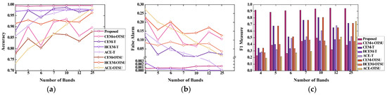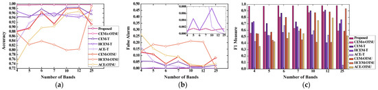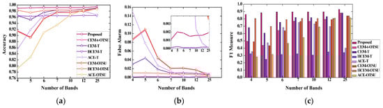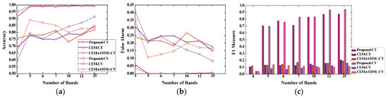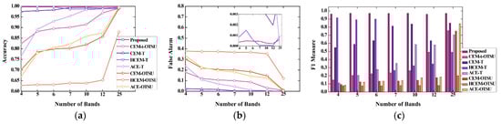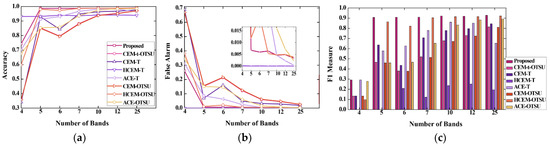 Wang [10] et al. discussed that the decrease in spectral resolution caused by the reduction of bands has a serious impact on the performance of comparison methods. Figure 8 (ASRC-net) and Figure 9 (AIRC-net) compare the , , and corresponding to the detection results of the seven algorithms, respectively. As compared with several other algorithms, the proposed algorithm maintains relatively high target contour integrity due to the combination of the improved t-OTSU algorithm and the ORE algorithm. When the number of bands reduces from 25 to 4, the values corresponding to the ASRC-net and AIRC-net are above 0.996 and 0.995, respectively, which are higher than the compared algorithms. The values corresponding to the proposed algorithm are below 0.0015, which is slightly higher than the HCEM-T algorithm. The value considers both the precision and the recall, which reflects the performance of the camouflaged target detection algorithm more comprehensively [33]. When the number of bands is above 5, the value corresponding to the ASRC-net result obtained by the proposed algorithm stays above 0.9. It has to be pointed out that the highest value corresponding to other algorithms is only 0.81 (CEM-T), as presented in Figure 8c. When the proposed algorithm is applied to detect AIRC-net in MSIs with four bands, the result is around 0.91. The specific analysis of detection results and quantitative metrics shows that in a simple urban background (Lawn) with sufficient light (light intensity: 19,618 lux), the proposed method shows good performance and robustness in detecting different camouflaged targets.