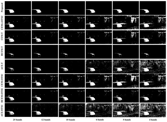 Figure 22 shows that the performance of the proposed method is significantly better than the CEM algorithm. In addition, the advantages of the t-OTSU algorithm gradually become apparent as the number of bands decreases. Interestingly, the proposed method has better detection results for the CV target than the CT targets. We analyze that the reason may lie in the fact that the CT target is propped up, with a less flat surface and more folds, which leads to an increase in spectral variability that reduces the target detection performance [7]. The CT target surface is flatter and more regular in shape, which is more favorable for our algorithm. When the number of bands is reduced to four, the detection accuracy of the proposed algorithm decreases significantly, and we consider that it may be caused by the unsuitability of the selected bands. Since these four common bands are selected based on the previous experimental scenarios, the UAV scene varies considerably relative to the previous scenes, and other more representative band subsets exist in the UAV scene. In general, the proposed algorithm is more robust than other algorithms, showing good detection performance in this complex UAV scene.