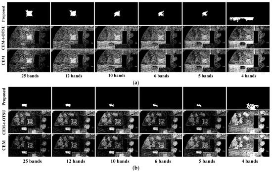 The detection results of the two targets are shown in Figure 21a,b, respectively. Compared with the previous scenes, such as the Lawn scene and the BT scene, the performance of the CEM algorithm significantly declines in this scenario, and it is difficult to identify the position of the camouflaged targets. In our method, the completeness of the contour decreases as the bands decrease, but the position of the camouflaged targets can still be easily distinguished. When the number of bands reduces to four, the performance of the proposed algorithm degrades greatly.
