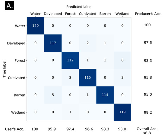 Confusion matrix including user’s, producer’s, and overall accuracy for the recurrent convolutional neural network on (A) 2011 test data and (B) 2000 test data. The difference in per class totals (120 vs. 100) is based on the process of generating 150 pixels per class from the NLCD dataset and then manually validating. The correct class was visually validated, mixed pixels were rejected, and then all classes were subset to the same number as the class with the least number of validation pixels.