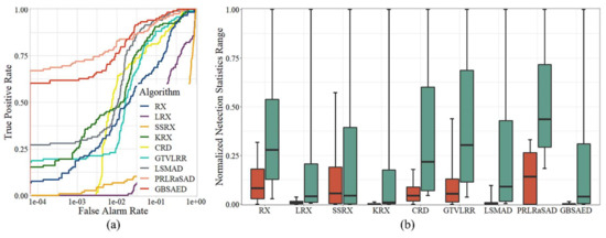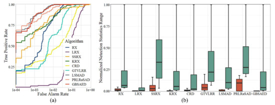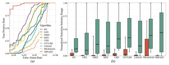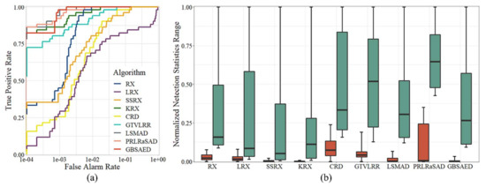 Figure 5 visualizes the detection results for the Texas Coast Image obtained by each algorithm. As shown in the figure, the RX, LRX, and GTVLRR contained stripes because these methods retain spectral band data with stripe noise. The RX, LRX, and CRD results had numerous major false alarms. The SSRX, LSMAD, and PRLRaSAD results showed good performance, but had poorly restrained backgrounds. KRX had better detection results, but high time cost. GBSAED could restrain the background well and also clearly recognized anomalies. The ROC curves presented in Figure 6a indicate that the proposed GBSAED algorithm performed better performance than the other algorithms. In addition to a low false alarm rate, GBSAED also showed good performance. The box plots presented in Figure 6 show that the GBSAED algorithm is better able to restrain the background, and thus can easily separate background from anomalous pixels. The AUC value of GBSAED was 0.9993, which was higher than the values of all other algorithms tested. Combined with the operation time analysis outlined in Table 3, this result demonstrates that GBSAED is a promising detector with low processing cost.
