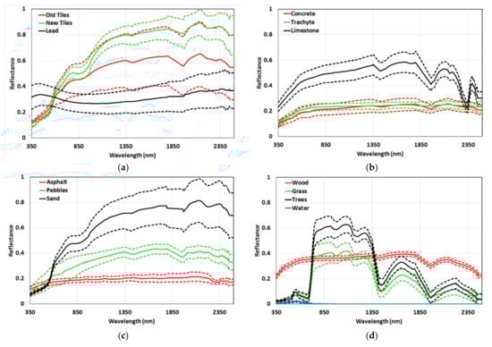 The hyperspectral library of main urban surface materials of the historical center of Venice and the variability of each class (i.e., the mean spectrum was plotted with a solid line and the mean spectrum plus the standard deviation and minus the standard deviation were plotted with dashed lines): (a) the spectra of Old Tiles, New Tiles, and Lead classes; (b) the spectra of Concrete, Trachyte, and Limestone classes; (c) the spectra of Asphalt, Pebbles, and Sand classes; (d) the spectra of Wood, Grass, Trees, and Water classes.