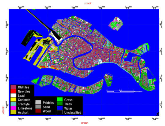 A careful analysis of the literature and the knowledge of the city acquired during extensive field campaigns, which were conducted from June to September 2001, in June 2004, and May 2005, led to the identification of thirteen classes of materials that well summarize the land cover materials of the historical center of Venice (Table 2 [,]). During these campaigns, many images were acquired by panchromatic, multispectral, and hyperspectral sensors characterized by different spatial resolutions [,,].