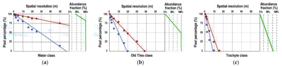 The masks were resampled at many spatial resolutions (i.e., 0.5, 1, 2, 2.5, 5, 10, 16, 20, and 50 m) to better calculate the best fitting functions that were required to assign percentages of pixels with the abundances of 100% and more than 75% and 50% to the spatial resolutions of most remote sensing images. All the best fitting functions calculated were linear. Figure 4 shows—as an example—the scatterplots of Water, Old Tiles, and Trachyte classes which were obtained using the mean values for all zones.
