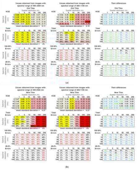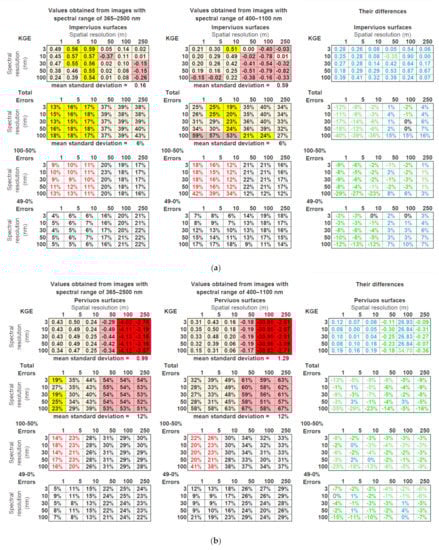 With reference to the pervious surfaces, the spectral resolution and spectral range requirements were met by the KGE, Total Errors, 100–50% Errors, and 49–0% Errors values (Figure 6b). The spatial resolution requirement was not met by the KGE values: the greatest values were obtained from the images at the spatial resolution of 5 m (their mean percentage of mixed pixels equal to 47%, Table A3), and their values decrease slightly as spatial resolution increases, while they decrease rapidly as spatial resolution decreases except for spatial resolution of 250 m. The spatial resolution requirement was met by Total Errors values obtaining from the images with both spectral ranges.