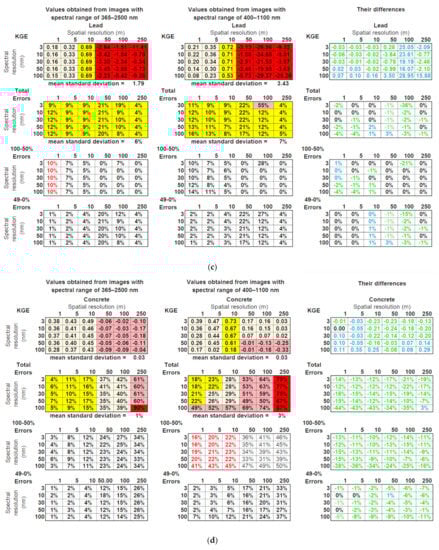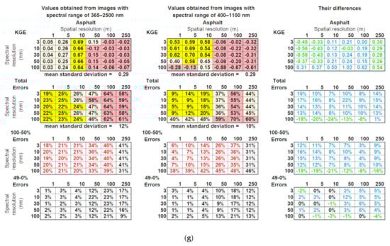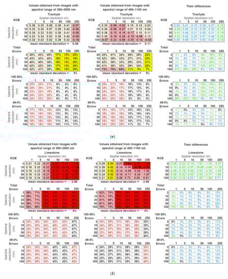 KGE, Total Errors, 100–50% Errors, and 49–0% Errors values were assembled into arrays with six columns and five rows representing the selected spatial and spectral resolutions. Figure 5 shows the arrays made to assess and compare classification results of Old Tiles, New Tiles, Lead, Concrete, Trachyte, Limestone, and Asphalt endmembers (Figure 5a–f, respectively). In Figure 5, the matrices on the left show the values obtained from the images with the spectral range from 365 to 2500 nm, the matrices in the middle show the values obtained from the images with the spectral range from 400 to 1100 nm, and the matrices on the right show the difference between the values of the first and second matrices.