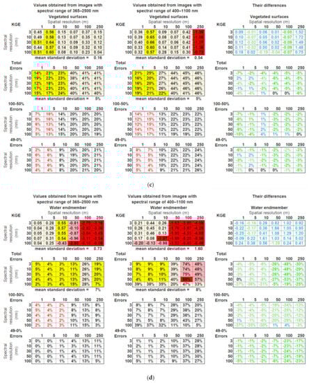 Figure 6 shows weighted averages of KGE, Total Errors, 100–50% Errors, and 49–0% Errors values arranged in matrices to evaluate and compare the classification results of impervious, pervious, and vegetated surfaces, and Water endmember (Figure 6a–d, respectively). In Figure 6, the matrices on the left show the values obtained from the images with the spectral range of 365–2500 nm, the matrices in the middle show the values obtained from the images with the spectral range of 400–1100 nm, and the matrices on the right show the difference between the values of the first and second matrices.