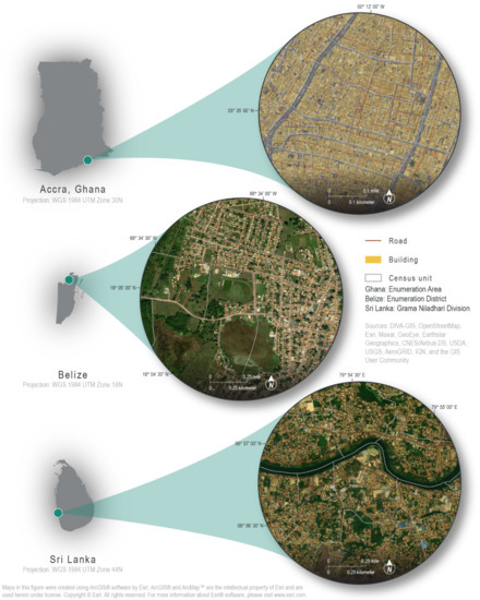 - Sandborn, A.; Engstrom, R.N. Determining the relationship between census data and spatial features derived from high-resolution imagery in Accra, Ghana. IEEE J. Sel. Top. Appl. Earth Obs. Remote Sens. 2016, 9, 1970–1977. [Google Scholar] [CrossRef]