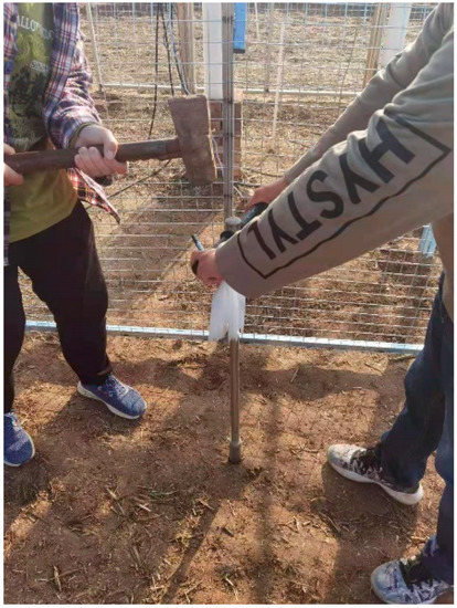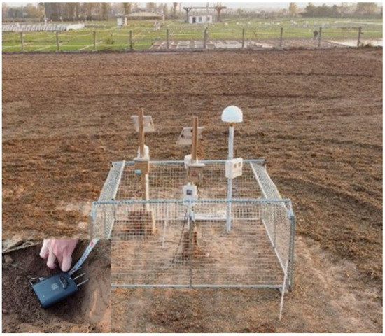 An experimental site was set up in Fengqiu County, Henan Province, China (latitude 35°01′34″ and longitude 114°33′30″). The surrounding environment and experimental equipment are shown in Figure 4 and Figure 5. The receiver was installed on flat ground. Winter wheat had just been sown in the soil and was in a dormant period. During the measurement period, there was no vegetation growth, and the soil was be considered to be bare soil. The experimental area was approximately a square with side lengths of 160 m; therefore, the reflected signal was not affected by surrounding houses and other ground surfaces. A Sino M300 Pro Ⅱ receiver and antenna were used to collect the GNSS signals. The receiver coulf track BDS B1I, BDS B2I, GPS L1, and GPS L2 signals; however, it could only record the B2I signal from some satellites due to equipment limitations. In this experiment, we tracked and recorded data with an elevation ranging from 5 to 25 degrees. The soil moisture sensor was installed at 5 cm depth and provided soil moisture values at two-hour intervals. The experiment lasted 30 days, from day of year (DOY) 26–55 in 2021, and three rainfall events occurred. In addition, in order to ensure the soil moisture measured by the sensor was reliable, we used 10 days of manual measurement data (which could be regarded as the true soil moisture) to calibrate the soil moisture. Figure 6 shows a photograph of the manual measurement of soil moisture.