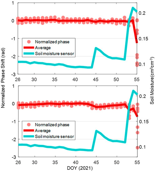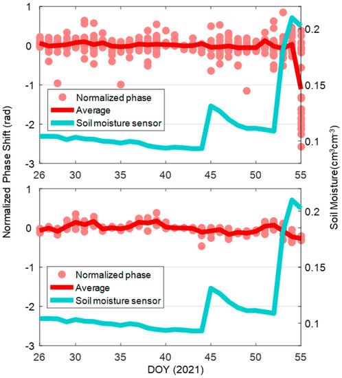 Figure 8 shows the normalized phase shift sequences of all the IGSO satellite tracks and the phase shift average results. During the experimental period, three rainfall events occurred, and the soil moisture changed significantly on DOY 45, 53, and 54. The IGSO B1I and B2I phase shift results both show a good correlation with drastic changes in soil moisture. When soil moisture increases about 0.1 cm3cm−3 on DOY 53–54, both B1I and B2I phase shift average results decrease about 1.2 rad and 0.6 rad, respectively; however, when the soil moisture only rises insignificantly (i.e., DOY 45), the IGSO B1I phase shift hardly changes, while the B2I phase shift has a clear downward trend. Similar to the result of C06 in Figure 7, the phase shift of C06 is also unstable on DOY 55. It further proves that a rainfall event increases the uncertainty of the phase shift. In addition, the normalized phase shift average results of BDS MEO and IGSO satellites are negatively correlated with soil moisture, which is similar to the GPS satellites in the previous studies.