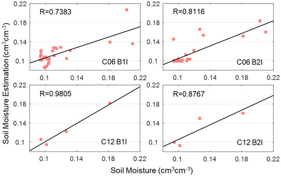 However, although the data amount of BDS MEO B2I is less than B1I due to the limitation of the receiver and satellites, as shown in Figure 11c,d, we can still see that the results of BDS MEO B1I and B2I seem to be similar. The estimations of the two BDS MEO signals show a significant correlation with soil moisture. The dots of B1I or B2I satellite track estimations that correlate well with soil moisture () are very close to the soil moisture curve.