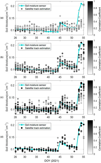 It is important to note that, although the sampling frequency of the soil moisture sensor was 2 h, we aggregated the daily soil moisture (i.e., we used the average of 12 values per day). This can be easily explained, since, although using the two-hour scale soil moisture data closest to the satellite observation time is more accurate, it would have been difficult to compare using the results obtained by these satellites because the satellite repeat observation times were not the same each day for all satellites. Therefore, we averaged the soil moisture per day and used it as the actual soil moisture variations. In fact, the soil moisture variation in a single day was very small without rainfall, and it hardly affected the results. When the rainfall events occurred, it was difficult to accurately measure the actual soil moisture that determined the reflected signal due to the seepage speed of rain and the soil heterogeneity. This is another reason why we chose daily soil moisture.