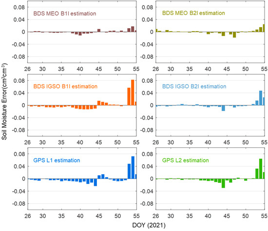 For a comprehensive comparison, we also calculated the multi-satellite estimation results of GPS satellites based on the above theory. Figure 12 displays the multi-satellite soil moisture estimation results by BDS MEO and IGSO satellites and GPS satellites; Figure 13 displays the errors between the estimations and soil moisture. The six estimation results show good agreements with the soil moisture fluctuations. During the period of insignificant fluctuations in soil moisture (i.e., from DOY 26 to 43), the errors between the six estimations and soil moisture are all less than 0.08 cm3cm−3. However, not all estimations respond well to the dramatic changes of soil moisture. From DOY 52 to 54, the soil moisture increased from 0.11 to 0.21 cm3cm−3, while BDS IGSO B1I, IGSO B2I, GPS L1, and GPS L2 estimations only increased to about 0.13–0.16 cm3cm−3. The accuracy in terms of error statistics of the six estimations are displayed in Table 3.