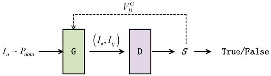The Generative Adversarial Network [] includes two adversarial learning sub-networks, a discriminator, and a generator, which are trained using the maximum–minimum game theory. The generator G obtains an image via a d-dimensional noise vector and produces a generated image as close as possible to the real image. On the other hand, the discriminator D is used to determine whether the input is a fake image from the generator or a real image from a real dataset. The loss function of the entire generative adversarial network is as follows: