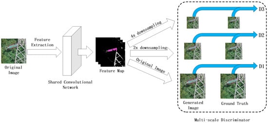 A discriminator network based on a multi-scale architecture is proposed in this paper. This network uses three discriminators, , , , with the same structures to process images at three different scales. Based on the parameter sharing mechanism [], a multi-task learning strategy is used in this paper for the training of the discriminator. We first extracted the basic characteristics of the real sample and the generated sample through the convolutional network and obtained the corresponding feature map. Then, we used 2 and 4 as sampling factors to down-sample the feature maps of the real and generated images to obtain feature maps at three different scales. Moreover, we used the three discriminators , , , to process the feature maps.