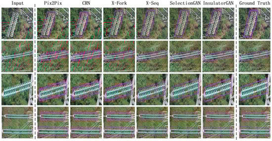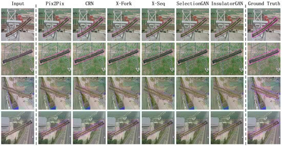 The qualitative experimental results are shown in Figure 5 and Figure 6. The resolution of the test images was 512 * 512. It can be seen that the image generated by InsulatorGAN in this paper was clearer, and the details of the object or scene were richer. When using the InsuGenSet and CPLID datasets, previous models are prone to generate fuzzy and distorted images. InsulatorGAN instead learned how to generate images of insulators with a strong diversity, producing more semantic details at the edges and connections of insulators. The wires, trees, and towers in the non-insulator area were observed to be realistic and similar to those of the Ground Truth.
