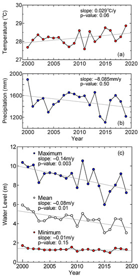 3.3. Trends of Air Temperature, Precipitation, Water Level, and Water Temperature