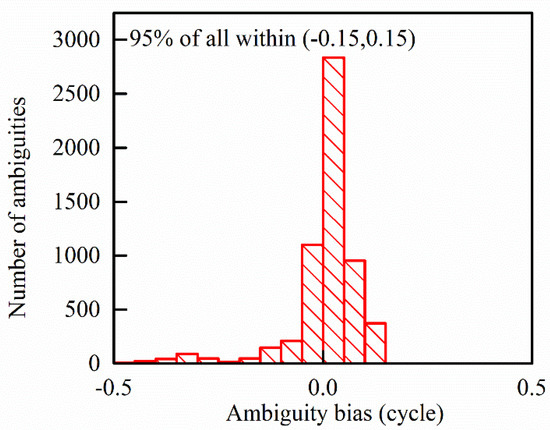 As shown in Figure 2, more than 95% of SD-Float for the ambiguity substitution approach ambiguities are closer to an integer within 0.15 cycles. This ambiguity bias indicates that the ambiguity substitution approach can separate the SD UPD and retain the integer characteristics of SD-Float ambiguities.