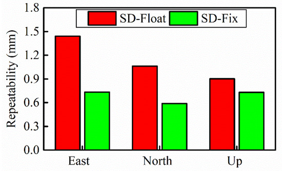 The daily repeatability values of SD-Float solutions, shown in Figure 4, are 1.44, 1.06, and 0.90 mm in the east, north, and up directions, respectively, while those of SD-Fix solutions are 0.73, 0.58, and 0.73 mm, respectively. Compared with SD-Float solutions, the daily repeatability improves by approximately 49%, 45%, and 19% for SD-Fix solutions in the east, north, and up directions, respectively.