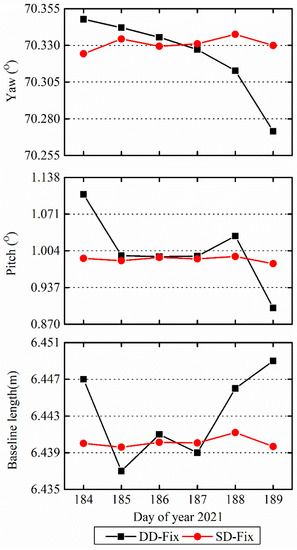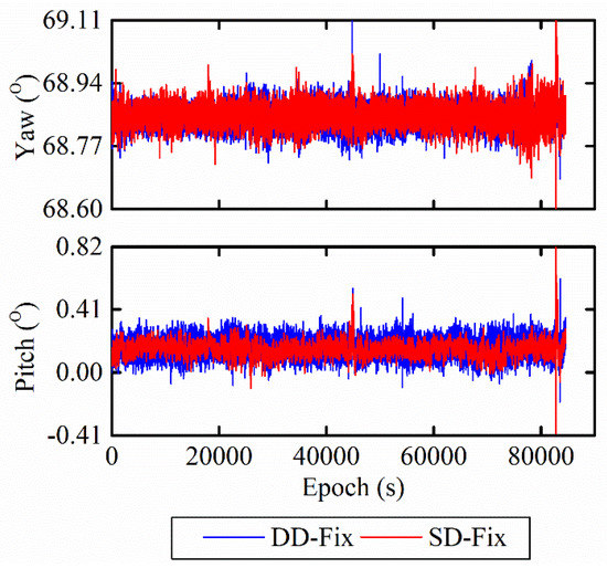 Moreover, the attitude angles in Figure 6 and Figure 7 prove one limitation is that the DD observables introduce more multipath and noise than SD observables. This limitation is one of the reasons for the large dispersion of DD-Fix. On the contrary, the residuals with lower noise obtained by the SD observables are more convenient for analyzing the spatial correlation between individual satellites and satellite-elevation-dependent effects, such as in the case of GNSS stochastic models [9] and GNSS absolute antenna calibration [29].